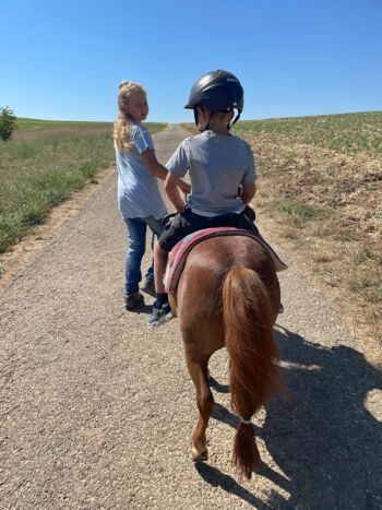 Ich arbeite hauptsächlich mit Ponys und Kleinpferden, daher liegt das Maximalgewicht bei ca. 90 kg bzw. 22 kg für die „magische Ponystunde“. In einigen Fällen bietet es sich an, mit dem Pferd ausschließlich vom Boden aus zu arbeiten.